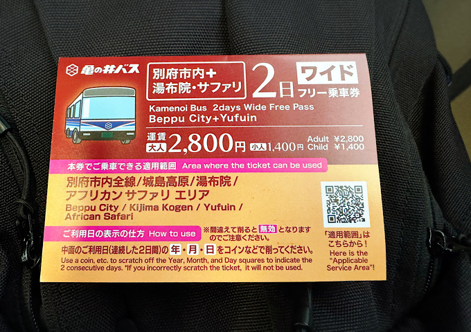 湯布院に行くので今回はワイドフリー乗車券の2日乗り放題を購入。別府〜湯布院って意外と距離があって、バスで1時間半ほど。乗り放題にしておくと気持ち的にもラクでおすすめ。