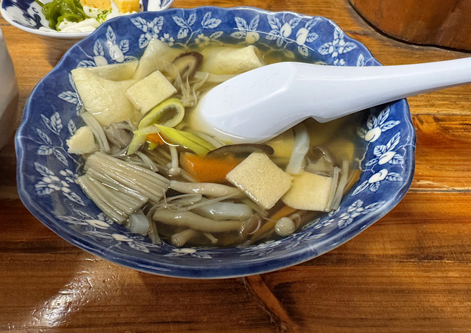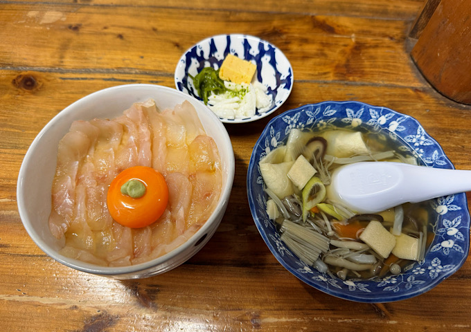 マグロ丼や海鮮丼もありますが、もちろんひらめ丼1択。追加料金で八戸名物のせんべい汁に変更できるので、今回は変更してもらいました。