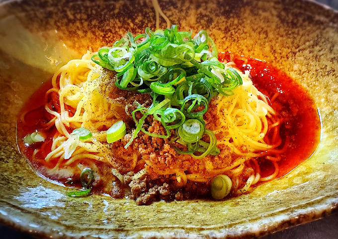 汁なし担々麺は、山椒や花椒を効かせたタレと麺を混ぜて食べるスタイルで、広島発祥のB級グルメとして人気。