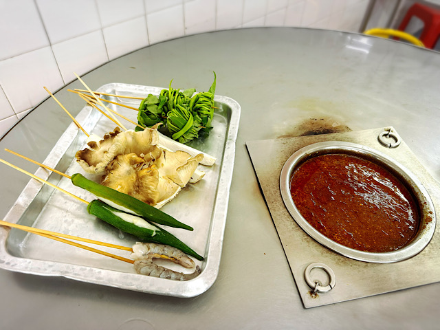 串に刺した魚介類や肉、野菜を、グツグツ煮えたぎるピーナッツベースの濃厚サテソースにつけて、火を通しながら食べる鍋料理です。