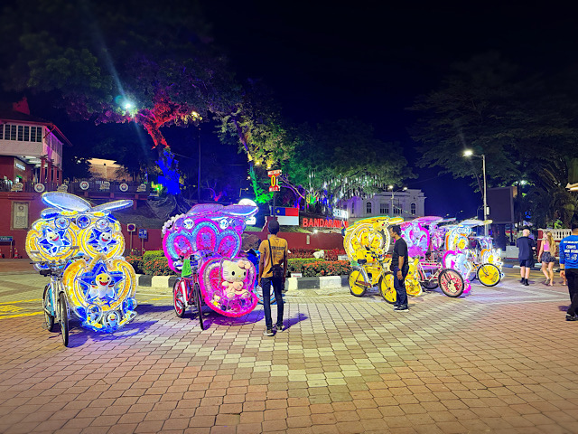これもマラッカ名物の「トライショー」、電飾と音楽で飾られた観光用自転車です。