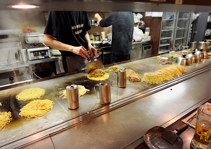 予約なしでしたが運よくカウンターが空いてて入店成功!カウンター席は、目の前で職人さんがお好み焼きや鉄板焼きをサクサク焼いていくのが見られて最高。