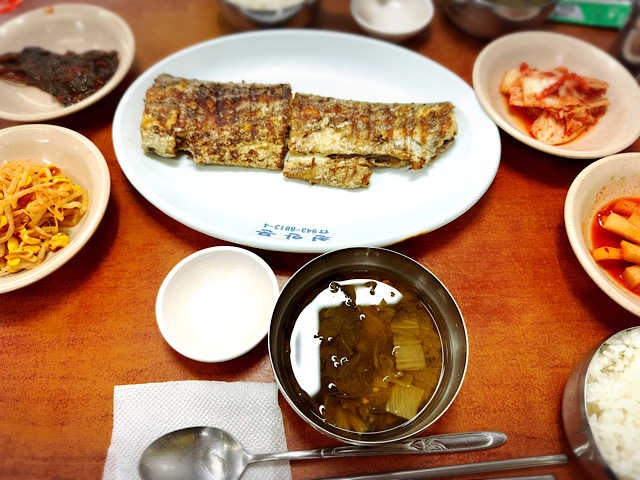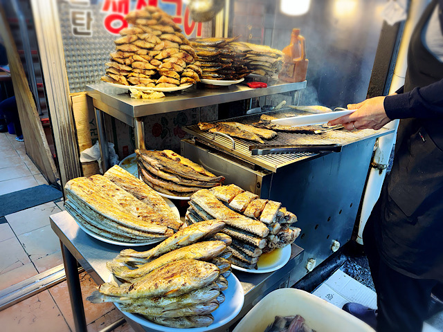 まずは朝食から。東大門のお魚通りで、いつものタチウオの焼き魚定食。